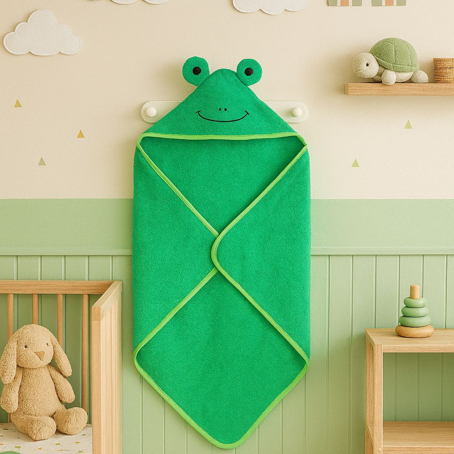 Doğanın neşesini ve enerjisini taşıyan yeşil kurbağa figürlü havlu kundak, bebeğinizin banyo sonrasını hem konforlu hem de eğlenceli bir hale getiriyor. %100 pamuktan üretilmiş bu havlu, yüksek emiciliği ve yumuşacık dokusuyla bebeğinizin hassas cildine zarar vermez, onu nazikçe sarar.