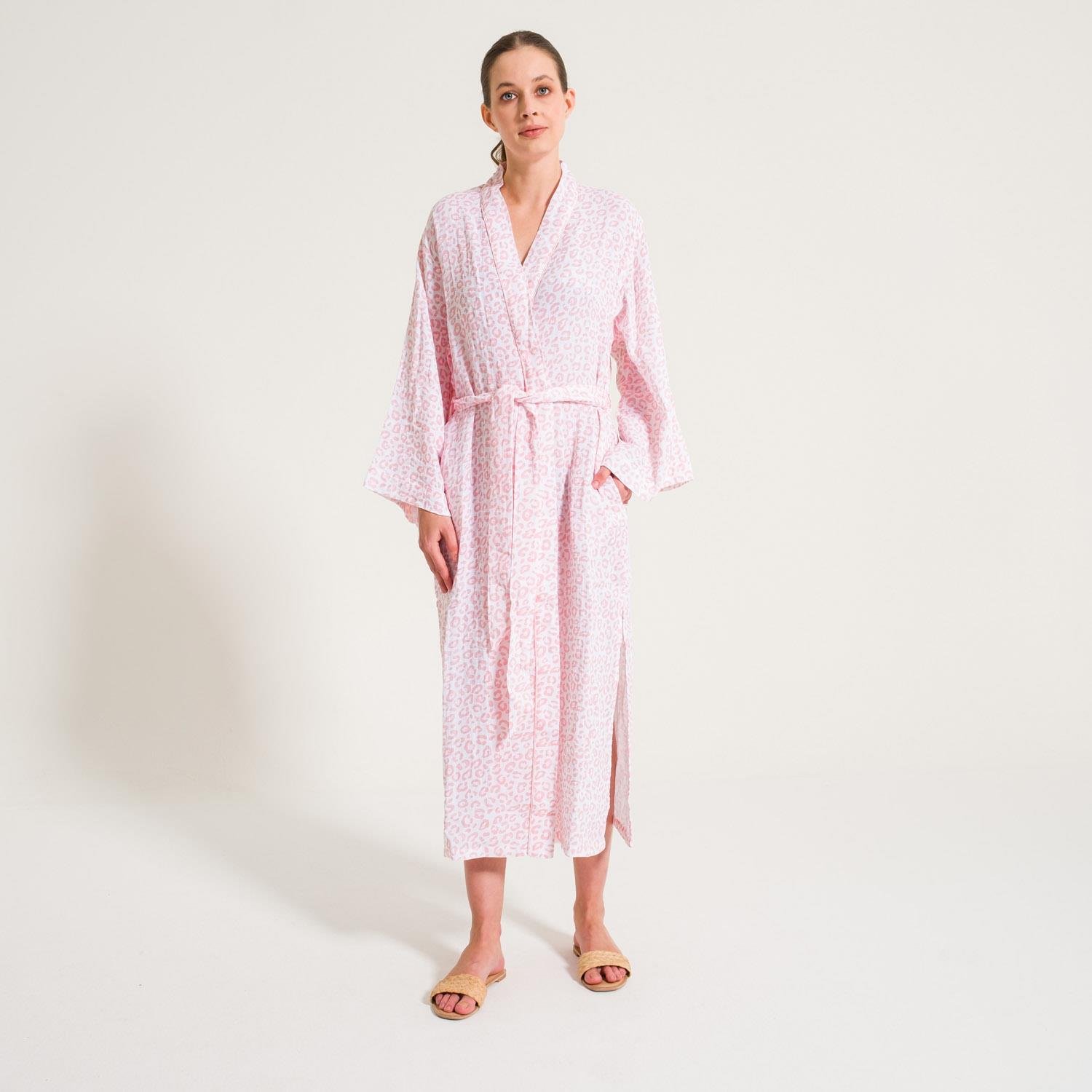 - Çift katlı müslinden üretilmiştir. Leopar desenli, iki tarafta cepleri ve ayarlanabilir kuşağı mevcuttur.