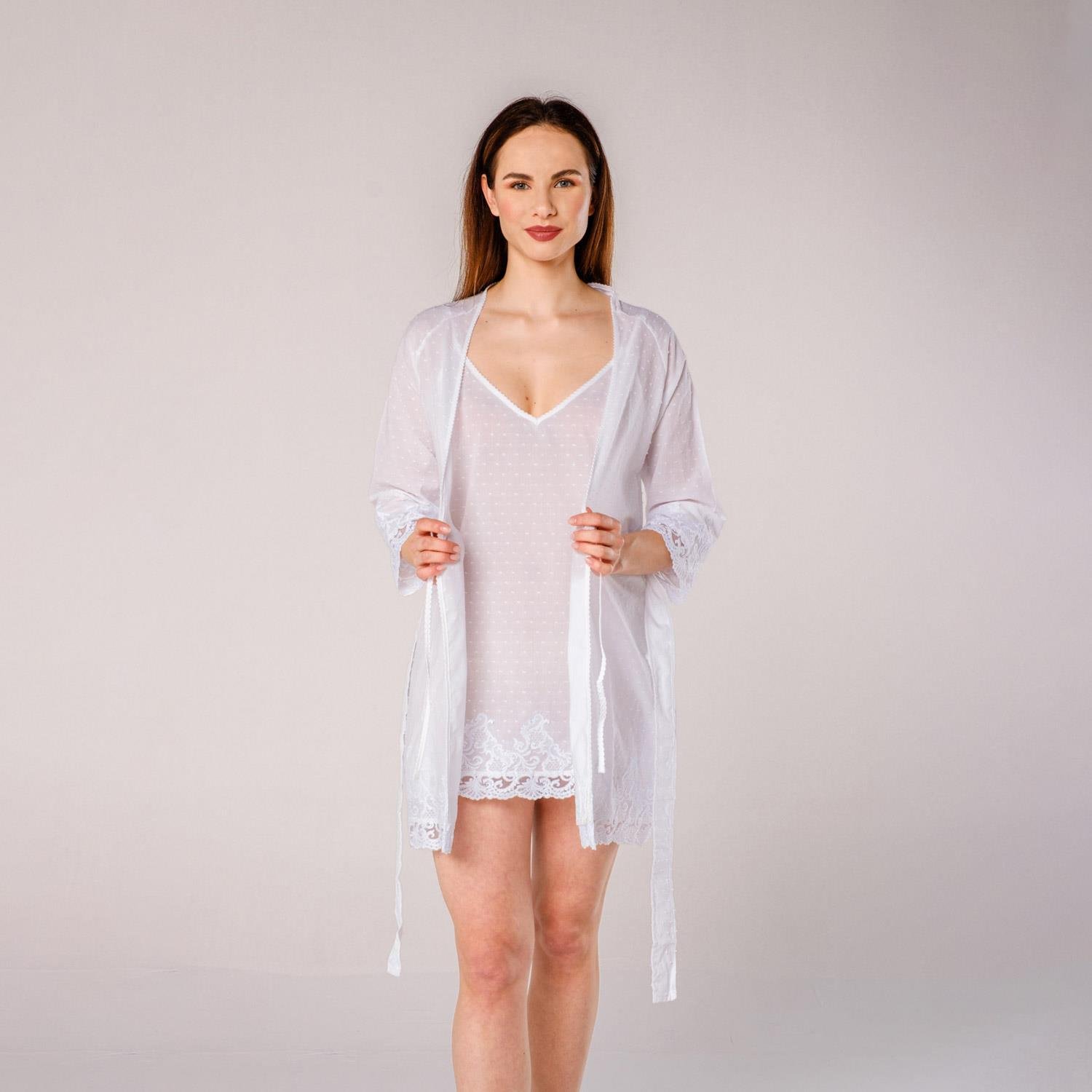 Set içerisinde ip askılı, dantelli gecelik ve dantelli sabahlık vardır.